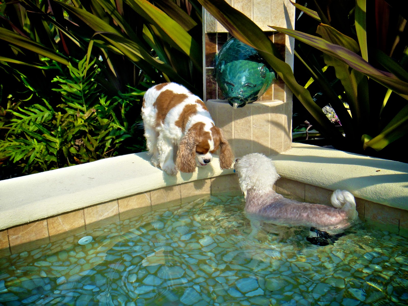 This awesome pool belongs to a friend and neighbor of ours. When building it, he sectioned off a large area specifically for dogs, where the water is about a foot and a half deep.